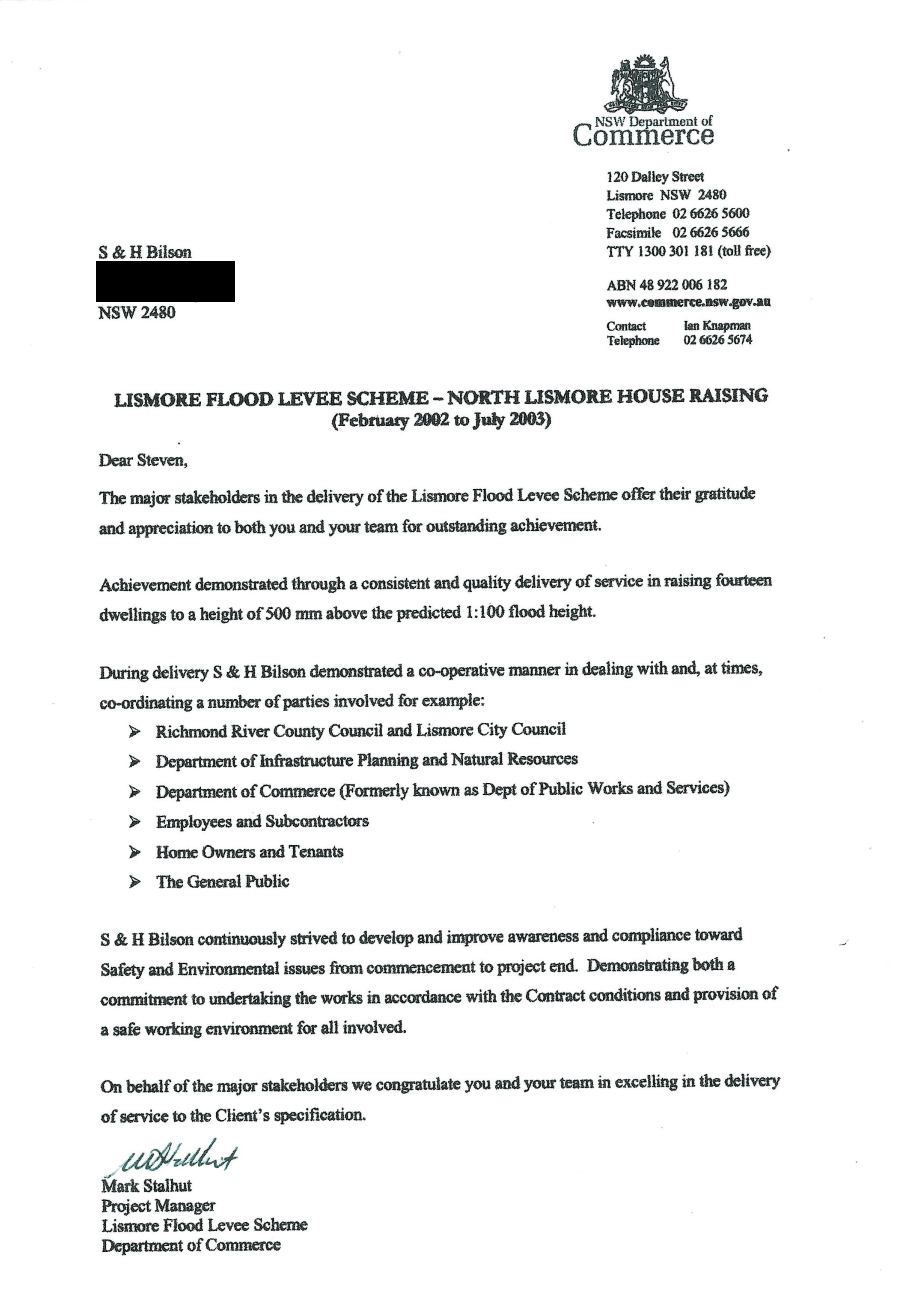 Managed by Steven Bilson, have re-established his house-lifting business to support Lismore's recovery.